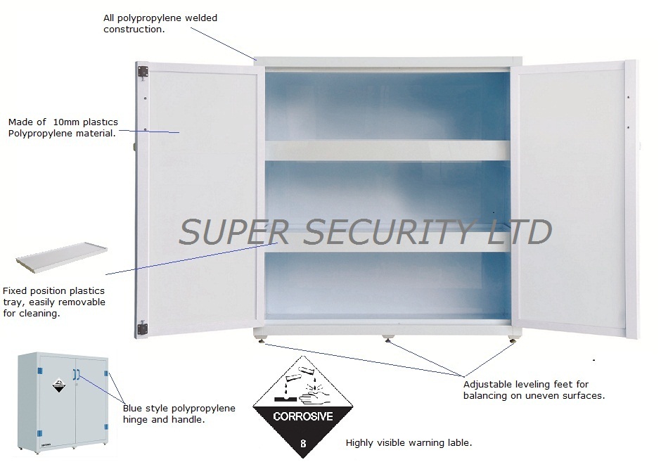 Polypropylene is the material of choice for acid and corrosive cabinet chemical storage.