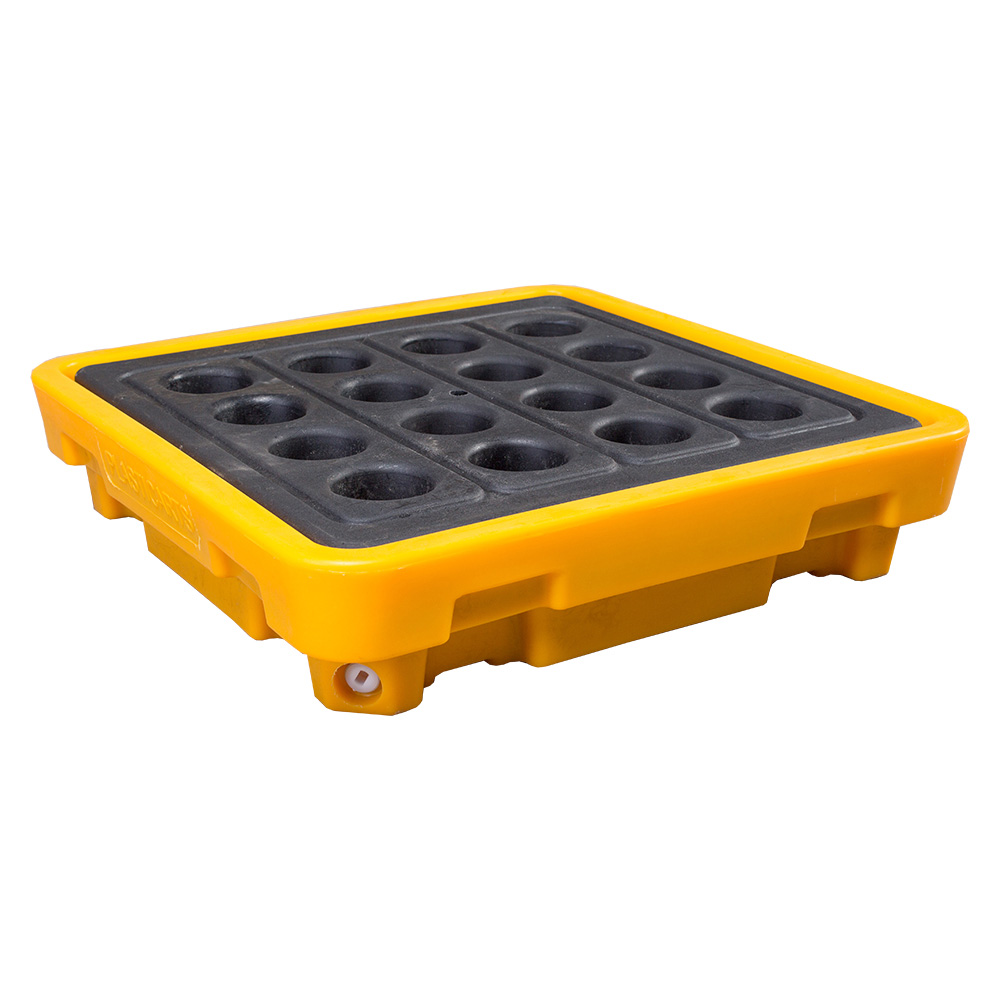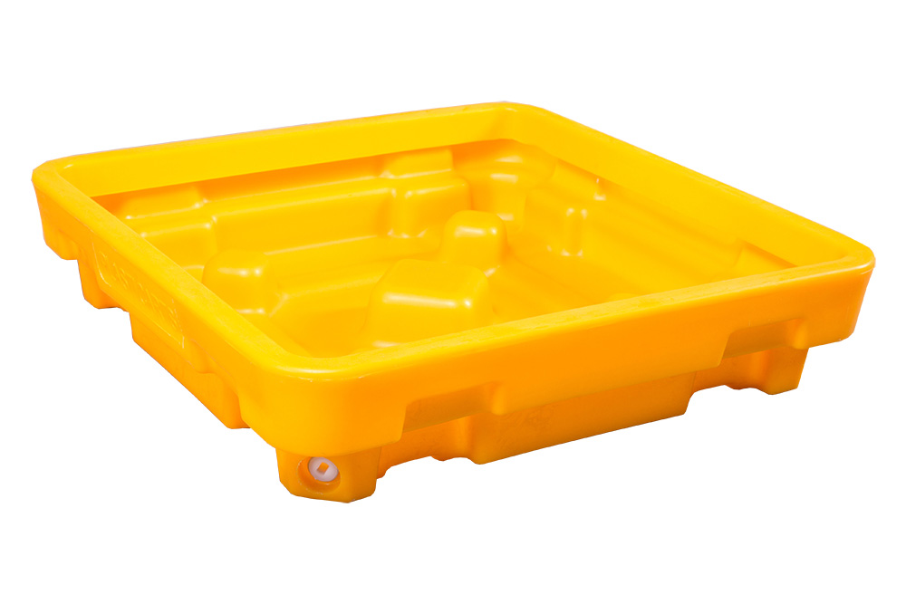 Two-drum spill pallet with built-in drain are made from 100% Polyethylene by injection molding.